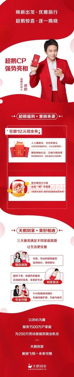 天鵝到家的華麗轉身,是家庭服務行業值得學習的標桿。多年來致力于建立規范、專業的服務標準,天鵝到家打造了過硬的品質招牌。此次更名煥新著眼于市場拓寬和服務升級等多層次的品牌革新,并攜手觀眾緣極佳的代言人鄧超,展現了天鵝到家對“全國領先的家庭服務平臺”這一全新品牌定位的深入貫徹。