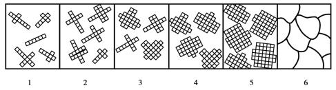 金屬結晶時,首先從液態金屬中形成一些極細小的晶體,這些極細小的晶體稱為晶核,它不斷吸附周圍液體中的原子而長大。與此同時,在液體中又不斷產生新的晶核并相繼長大,直到全部液體凝固為止,最后金屬便由許多外形不規則的小晶體(晶粒)所組成,如圖1.2.7所示。因此,液體金屬的結晶過程包括晶核的形成和晶核的長大兩個基本過程,而且這兩個過程是同時進行的。
