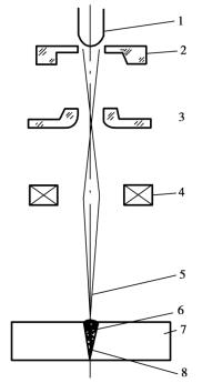 1—陰極 2—控制板 3—陽極4—電磁透鏡 5—電子束6—聚焦束 7—工件 8—焊縫