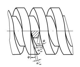 由于方牙螺紋、梯形螺紋,模數螺紋的螺距和多線螺紋的導程一般較大,因此它們的螺旋升角ψ也較大。在車削過程中,大螺旋升角對車刀工作角度有很大影響。以車削右旋方牙螺紋為例(圖5.2.21),大螺旋升角使左側刀刃的工作副后角α′oe變小,右側刀刃的工作副后角α″oe變大。如果方牙螺紋車刀兩側刃的副后角相等,則在車削過程中由于車刀左側副后刀面與牙槽摩擦增大,影響螺紋質量。為此,一般要把左側副后角磨得大些,其角度為(3°~5°)+ψ,而把右側副后角磨得小些,其角度為(3°~5°)-ψ,有的甚至為0°。這樣,在切削時左右兩側的工作副后角的大小才較為合適。