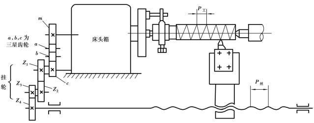 圖5.2.17是無進給箱車床從主軸到絲杠的傳動系統圖。車螺紋時,主軸的旋轉運動通過其尾端齒輪m、三星輪a,b,c和掛輪Z1,Z2,Z3,Z4傳給絲杠。由于齒輪m,c的齒數相同,所以三星齒輪只改變絲杠轉向,不改變系統的傳動比。那么,主軸與絲杠之間傳動比的調整,只需要更換不同齒數的掛輪即可。設車床絲杠的轉數為n,絲杠的螺距為P,工件的轉數為n,工件的螺距為P。當工件隨主軸旋轉一圈時,車刀移動的距離必須正好等于工件的螺距P。即