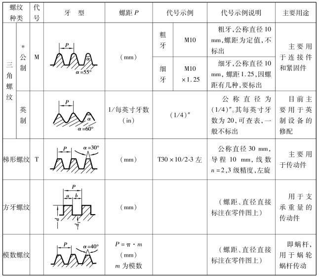 螺紋的種類很多,幾種常見螺紋的代號、牙型、螺距及主要用途見表5.2.2。